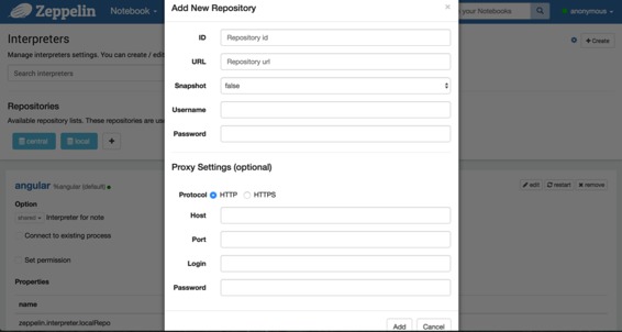 - 或者,如果您在企业防火墙后面,您还可以指定所有代理设置,以便Zeppelin可以使用给定的凭据下载依赖项