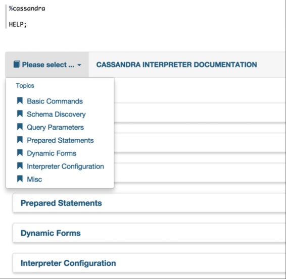 在段落中,使用%cassandra来选择Cassandra解释器,然后输入所有命令。