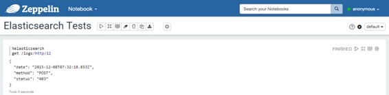 在段落中,用于%elasticsearch选择Elasticsearch解释器,然后输入所有命令。要获取可用命令的列表,请使用help。