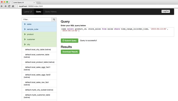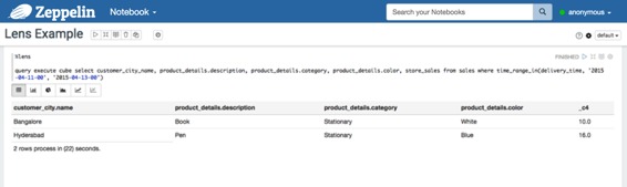 您可以使用OLAP Cube QL来分析数据,这是一种高级SQL类似语言来查询和描述以数据立方体组织的数据集。您可能会遇到OLAP立方体像这个视频教程。您可以在此视频中看到,它们使用的是镜头客户机外壳(./ bin / lens-cli.sh)。所有这些功能也可以使用镜头解释器在Zeppelin上使用。