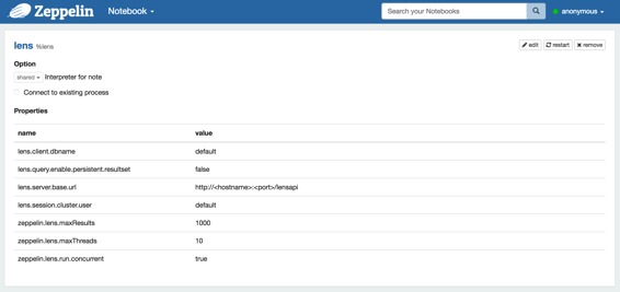 在“解释器”菜单中,您可以编辑Lens解释器或创建新的Lens解释器。Zeppelin提供Lens的这些属性。