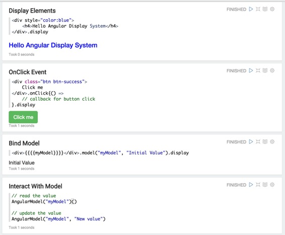 角度显示系统将输出视为AngularJS的视图模板。它编译模板并将其显示在Apache Zeppelin中。Zeppelin在您的解释器和您编译的AngularJS视图模板之间提供了一个网关。因此,您不仅可以从解释器更新范围变量,还可以在解释器中进行更新,这是JVM进程。