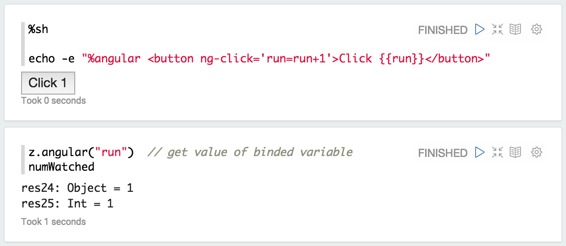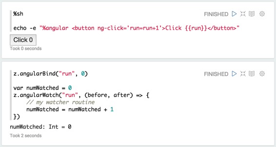 通过ZeppelinContext,您可以在AngularJs视图中观看/解除变量。目前,它只适用于Spark Interpreter(scala)。