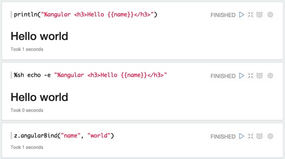 通过ZeppelinContext,您可以将变量绑定/解除绑定到AngularJS视图。目前,它只适用于Spark Interpreter(scala)。