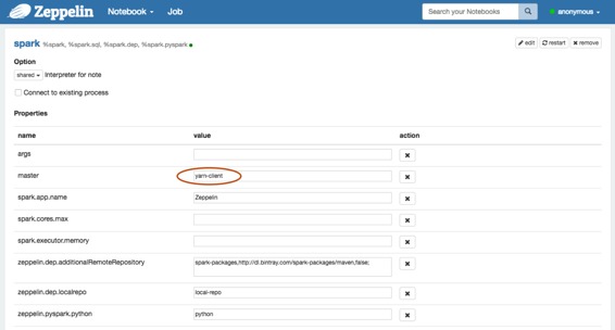 不要忘记在“Zeppelin Interpreters”设置页面中设置Spark master,如下所示。yarn-client