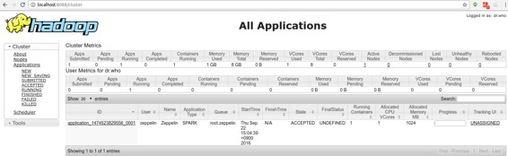 浏览http://<hostname>:8088/cluster/apps检查Zeppelin应用程序是否运行良好。