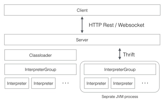 InterpreterSetting 是给定的 InterpreterGroup 和一个启动/停止解释器的单元的配置。同一个 InterpreterSetting 中的所有解释器都在单独的 JVM 进程中启动。解释器通过 Thrift 与 Zeppelin engine 通信。