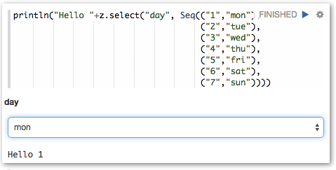 println("Hello "+z.select("day", Seq(("1","mon"),